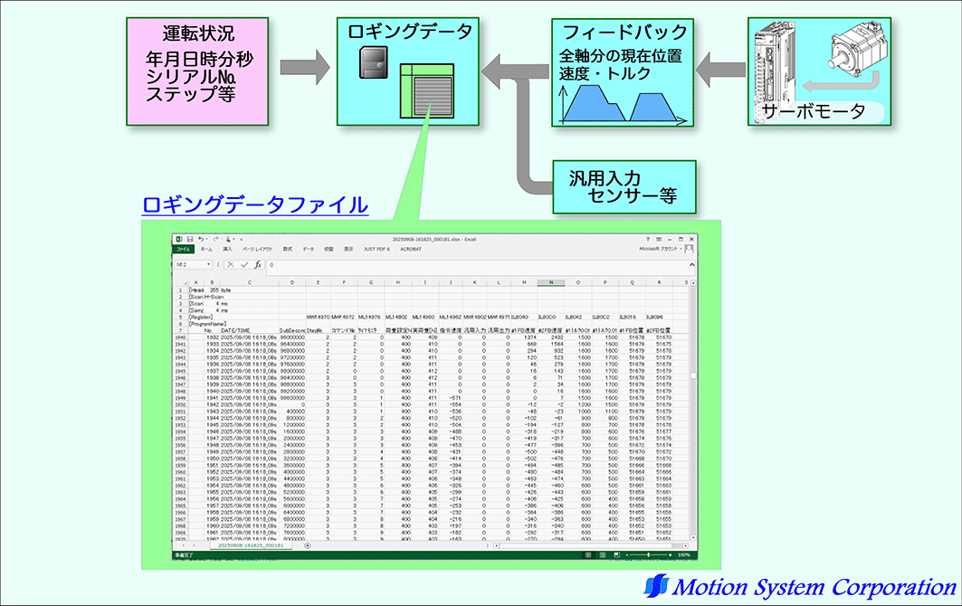 運転結果保存用のロギングデータファイルは,行(縦)方向はサーボ制御周期(2msec)毎に配列され,1製品毎に1ファイルに納められ,全数保存とします。