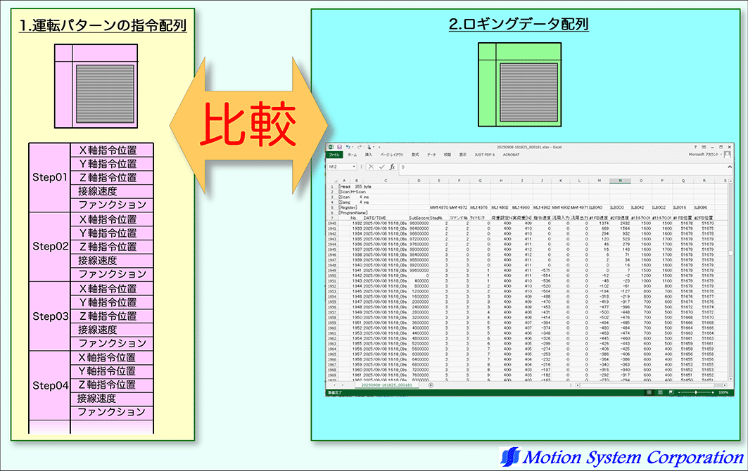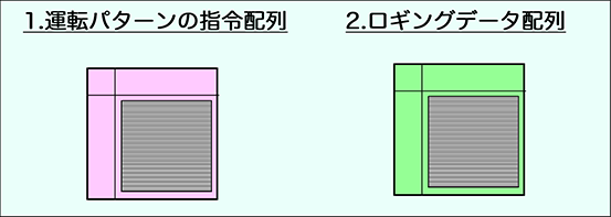 下図配列は,運転パターン指令としての配列データと,運転結果の保存用ロギングデータ配列の2種類を示します。