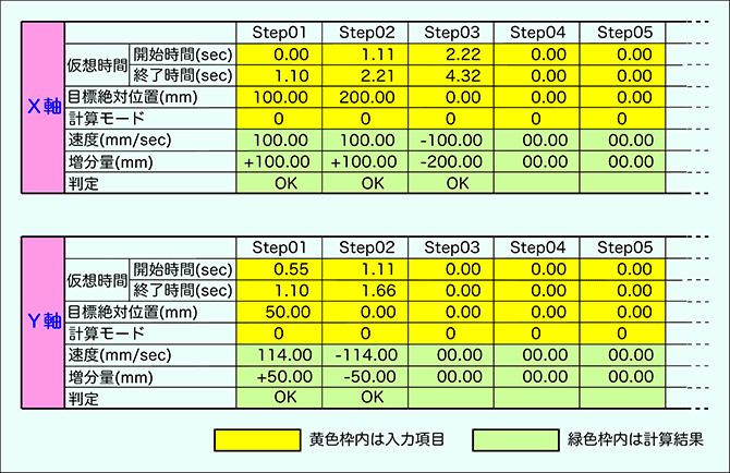 上記の設定では,各軸・各ステップ毎に,「開始時間」「終了時間」「増分量」の入力設定から,電子カム演算を実行して「速度」を求めます