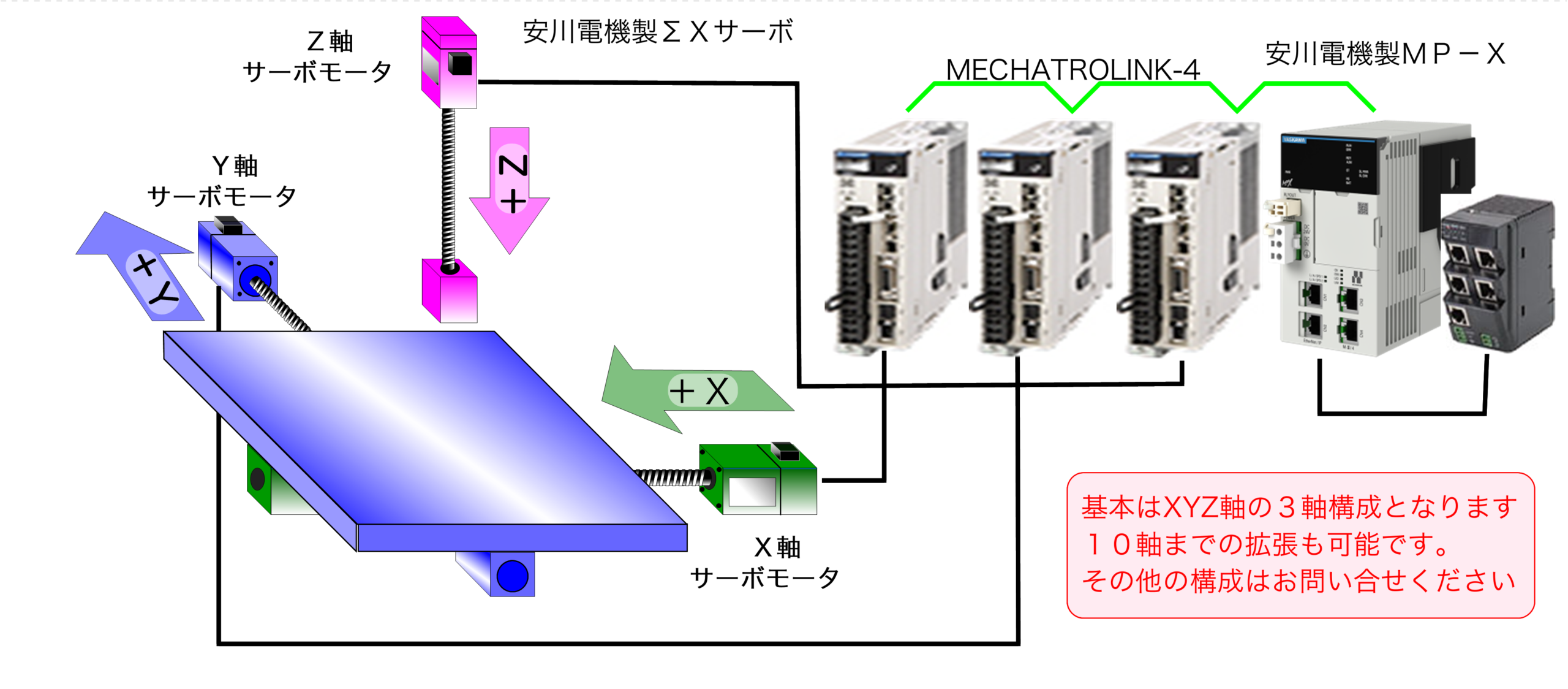 X・Y・Zの3軸構成が基本ですが,4~10軸の特殊な軸構成でも別途対応いたします。